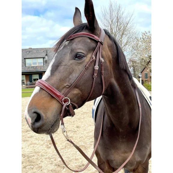 Attraktív zabla nélküli kantár, szép V alakú lakkbőr homlok résszel és hengeres bőr orr résszel. Igényes, puhán alápárnázott részekkel, anatómiailag formált tarkóval készül. Bőr, hátoldalán gumi csúszásmentes karabíneres szárral szállítjuk. Rendelhető fekete vagy barna színnel, pony, cob, full méretben. 5-ös fokozat az FRA skálán