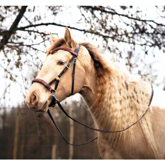 A lónak szuper kényelmes, vastagon alápárnázott, anatómiailag kialakított széles tarkó résszel. Kellemes fogású karabíneres bőr szárakkal együtt szállítjuk. Sidepull stílusban használható. Fekete és barna/fekete színben rendelhető, póni, cob, full mérettel. 3-as fokozat az FRA skálán
