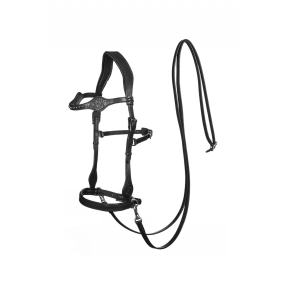 Elegánsan kidolgozott bőr sidepull kantár, homlok részén kétoldalt poncolt rozettával és kristályokkal készül, a rozettadísz a pofaszíjon ismétlődik. Anatómiailag formált, alápárnázott tarkórész, alápárnázott torok és orrszíj jellemzi. Karabíneres színben hozzáillő szárral szállítjuk.